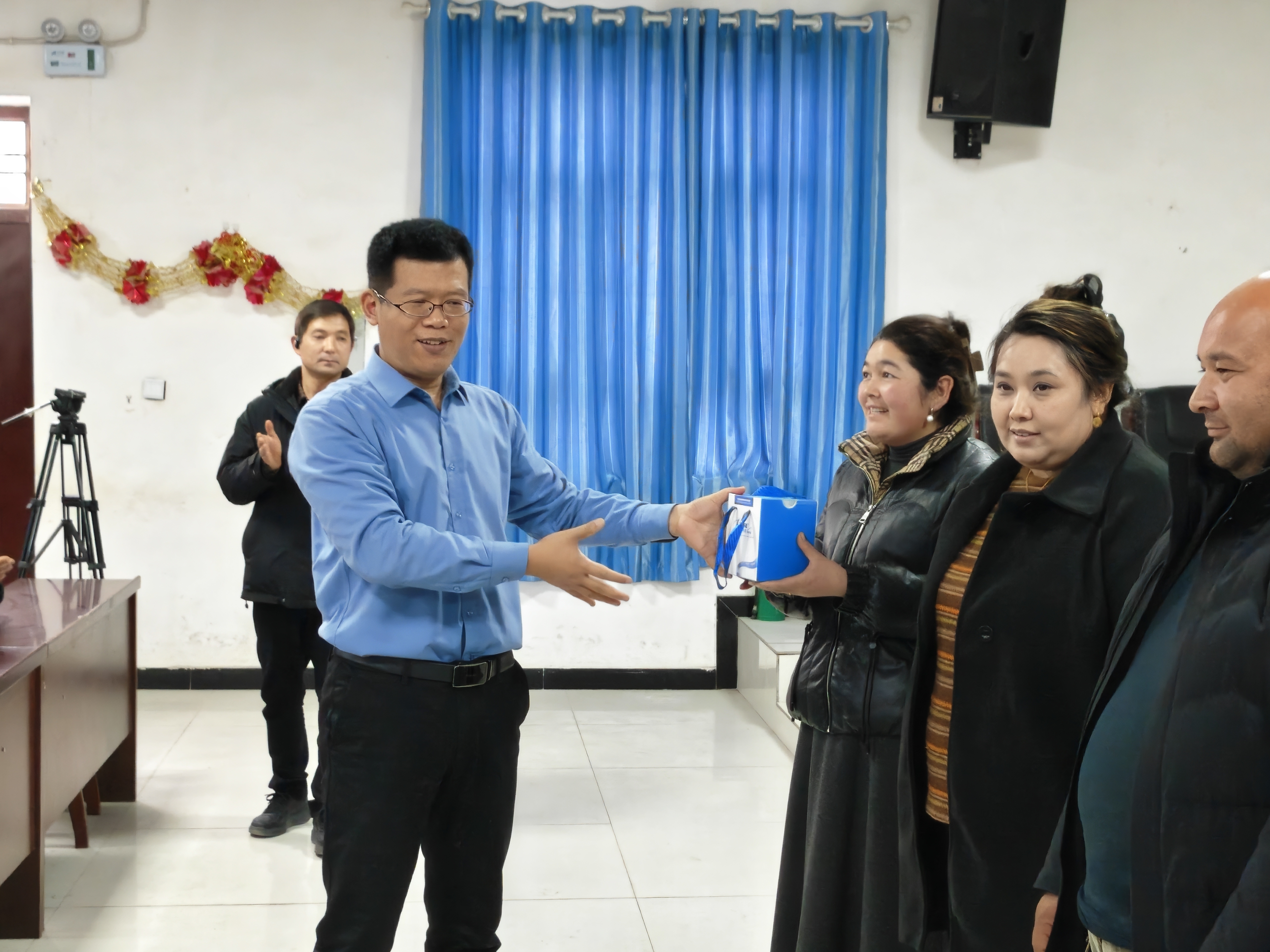 发布会现场,喀什地区行署副专员祖力甫哈尔·阿布都热甫与新疆农业大学校长郑文新共同为新书揭幕。随后举行了隆重的赠书仪式,广东省对口支援新疆工作前方指挥部组织人事处副处长杨刚毅与广东海洋大学滨海农业学院院长马驿共同向喀什地区基层畜牧技术人员代表捐赠图书。伽师县、泽普县、英吉沙县等六个县市的农业农村(畜牧兽医)部门代表上台接受捐赠。